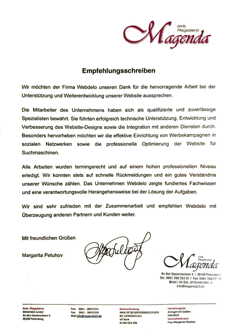 Einen wunderschönen guten Abend, mein Name ist Stas und ich möchte mich gerne im Namen unseres ambulanten Pflegedienstes bei der Firma Webdelo Studio für die erbrachten Dienstleistungen bedanken. Was die Jungs und Mädels innerhalb kürzester Zeit gemacht haben, macht mich fassungslos. Die haben uns von Google Seite 7 bei den Searches auf Google Seite 1 gebracht. Sie vertreten uns komplett auf jeglichen Social Media Plattformen. Die berühmtesten davon sind wahrscheinlich Facebook und Instagram. Es werden sehr viele Werbungen geschaltet. Es werden kurze Erklärungsvideos erstellt, die uns als Firma in der Region positionieren. Dadurch haben wir natürlich eine viel größere Auftragslage bekommen.